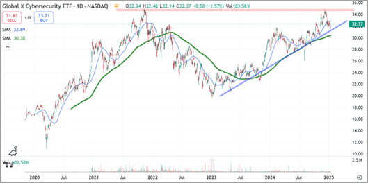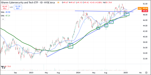 The CIBR technical picture is robust as the long-term structural trend extends out of a cup-and-handle base that formed throughout 2024 before breaking out during the fall, as shown below.