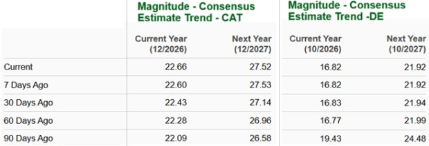 Both the earnings estimates for CAT have moved up over the past 90 days.Meanwhile, both earnings estimates for fiscal 2026 and 2027 for DE have been trending south over the past 90 days.
