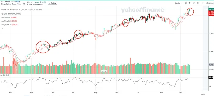 Conclusion first, the stance is neutral to mildly bearish into year-end, particularly for tech. The Nasdaq 100 is still about 2% below its late-October peak, and the slowing MA(3,7,10) configuration suggests a potential double top. On the other hand, although the Russell 2000 hit a new high on Thursday, its RSI has climbed to 83—an extremely bullish level where an inflection often occurs. Meanwhile, Nvidia's muted reaction this week, even after Trump's green light for H200 exports to approved Chinese customers, adds further uncertainty.