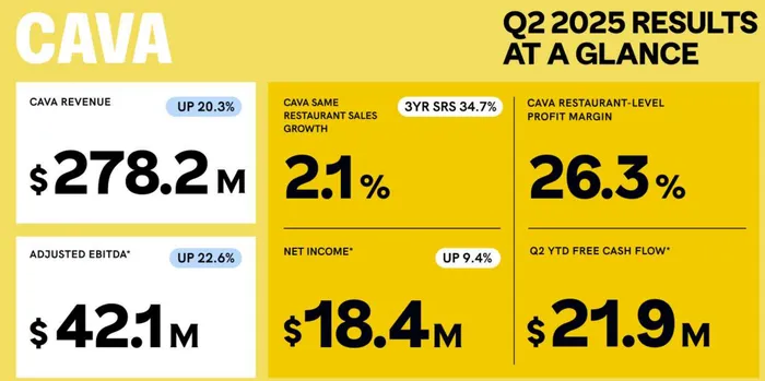 In other operational highlights, CavaCAVA-- opened 16 net new restaurants in Q2, ending the quarter with 398 units, a 16.7% year-over-year increase. It now plans to open 68–70 net new restaurants this year, up from the prior 64–68 target, underscoring confidence in unit growth even as comps moderate. Management maintained its FY25 adjusted EBITDA guidance of $152–$159 million and restaurant-level margin outlook of 24.8–25.2%, suggesting no major deterioration in profitability. Pre-opening cost guidance was nudged higher to $15.5–$16.5 million to account for the increased unit count.