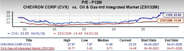 From a valuation perspective — in terms of forward price-to-earnings ratio — Chevron is trading at a premium compared with the industry average. The stock is also trading above its five-year mean of 11.86.