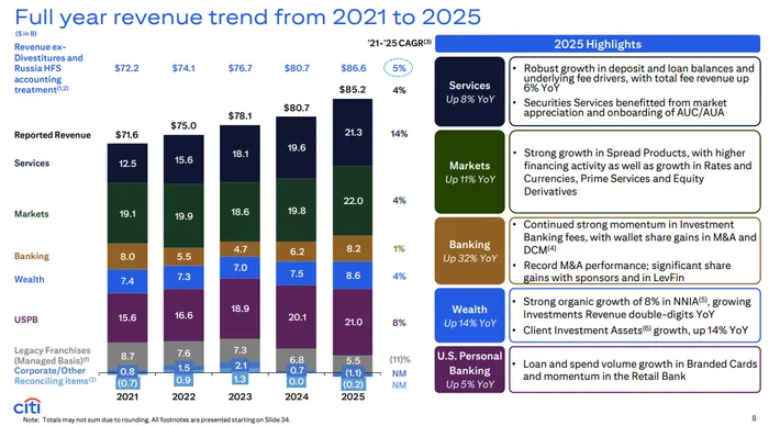 Expenses were higher, but investors didn’t punish Citi for it the same way they punished others, largely because the revenue and operating leverage delivery was strong enough to absorb the spend. Citi’s operating expenses rose 6% to $13.8 billion, driven by higher comp and benefits, legal expenses, technology and communication spend, and non-income tax charges, partially offset by productivity savings and lower deposit insurance costs. Those aren’t trivial increases, but Citi framed 2025 as a year of investment paying off, and CEO Jane Fraser emphasized positive operating leverage across all five businesses. Investors appear willing to accept some expense pressure if Citi can show that the spend is tied to sustainable revenue growth and improved returns — and this quarter supported that view.