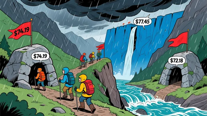 . Key support levels are emerging around $74.19 (March 17 low) and $72.18 (February 23 low), while resistance is clustered near $77.45 (March 19 high). A breakdown below $74.19 may confirm a bearish engulfing pattern, potentially targeting the next support at $71.50. Conversely, a rejection near $74.19 could trigger a short-term rebound, though the formation of a bearish harami or dark cloud cover remains probable if the price fails to reclaim $77.45.