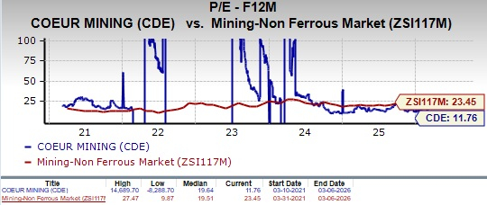 CDE is currently trading at a forward 12-month price-to-earnings multiple of 11.76X, below the industry average of 23.45X and its five-year median.