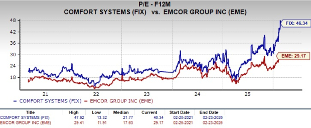 Considering valuation, over the last five years, Comfort Systems has been trading above EMCOR on a forward 12-month price-to-earnings (P/E) ratio basis.