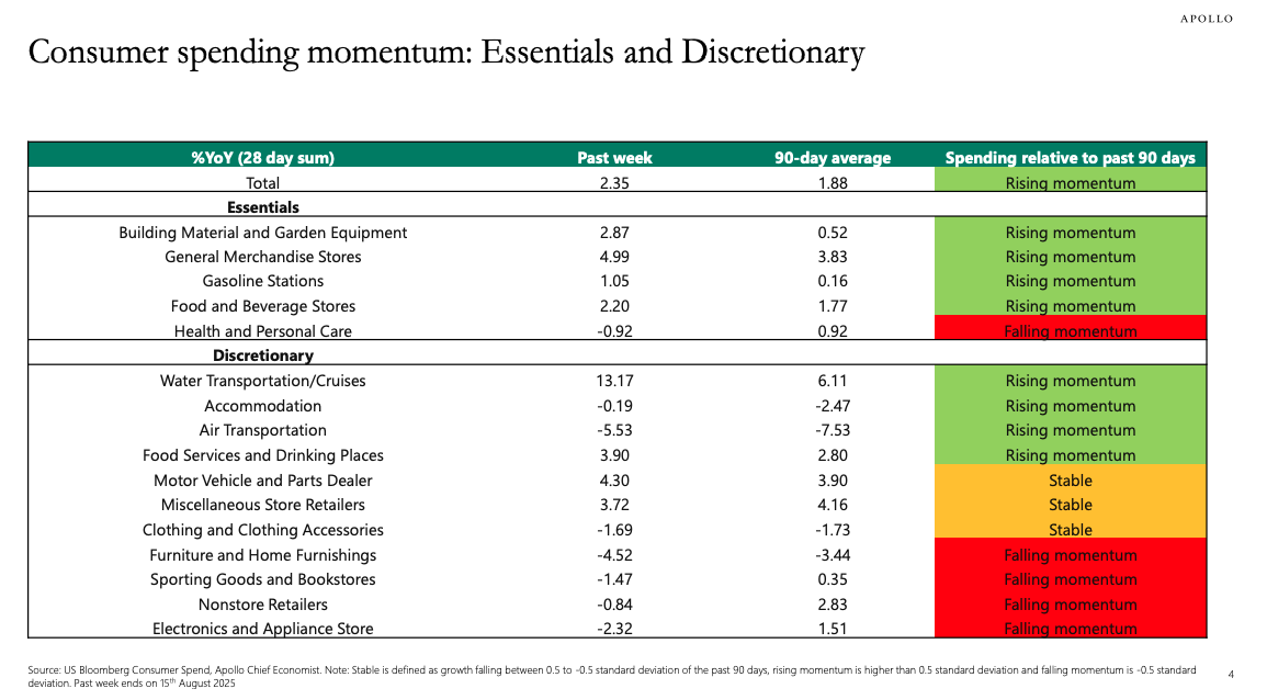 and led by Chief Economist Torsten Slok, shows that spending momentum has broadly stabilized after months of volatility. Following a sharp increase in purchases earlier this year—when households sought to front-load goods before tariff hikes—consumer outlays dipped but have since normalized.As of mid-August, total spending was up 2.35% year-over-year, above the 90-day average of 1.88%, indicating what Apollo termed “rising momentum”. Essentials such as food, beverages, and general merchandise drove much of this growth, while discretionary purchases showed stark divergences. Cruises and dining continued to expand strongly, while furniture, clothing, and electronics lagged.