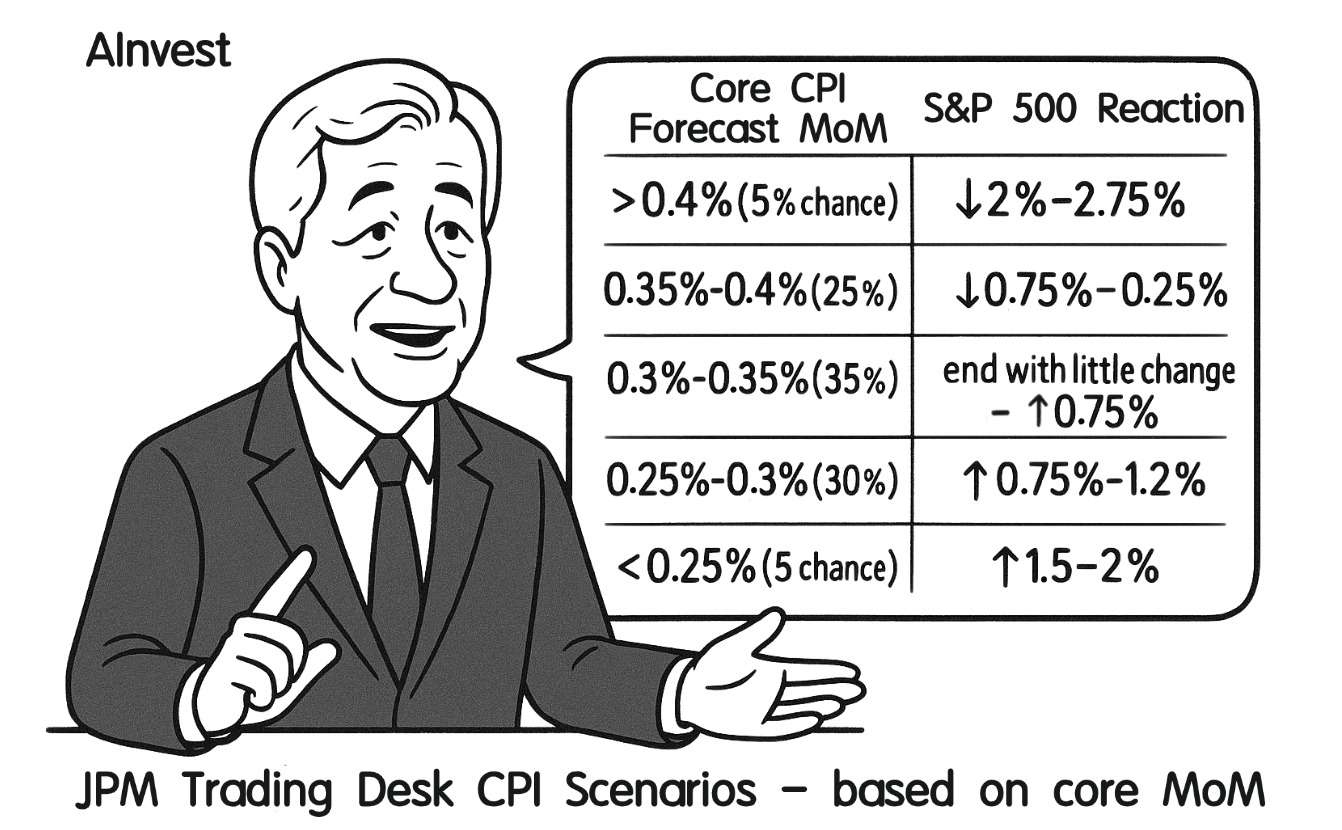 JPMorgan noted that if core CPI rises less than 0.30% MoM (35% probability), the S&P 500 could gain at least 0.75%, with upside of up to 2%. If the increase is between 0.30% and 0.35% (35% probability), the S&P may trade in a range from flat to +0.75%. But if core CPI tops 0.40% (5% probability), the index could drop more than 2%.