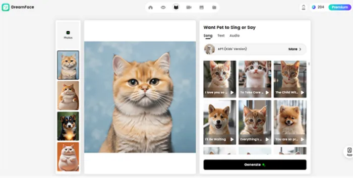 Dreamface Pet Lip Sync offers hundreds of pet-friendly lip sync songs in its extensive library. Whether you want your furry friend to sing pop hits, classic tunes, or even silly children’s songs, there’s a song for every mood. The AI tool even allows you to choose from fun, quirky kids’ voices, giving your pets a voice that’s as adorable as they are.