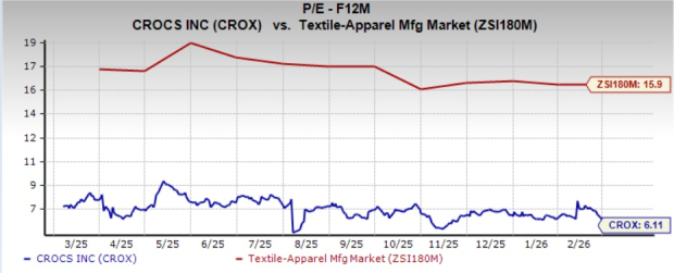 From a valuation standpoint, CROX trades at a forward price-to-earnings ratio of 6.11X, lower than the industry’s average 15.9X.