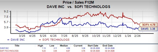 Dave is currently trading at a forward 12-month P/E ratio of 11.6 times, which is higher than the 12-month median of 25.17 times. SoFi TechnologiesSOFI-- is trading at 29.4 times, substantially lower than the 12-month median of 45.9 times. DAVE appears cheaper than SOFI in terms of the 12-month P/S ratio. DAVE currently trades at 3.38X while SOFI is at 4.78X.