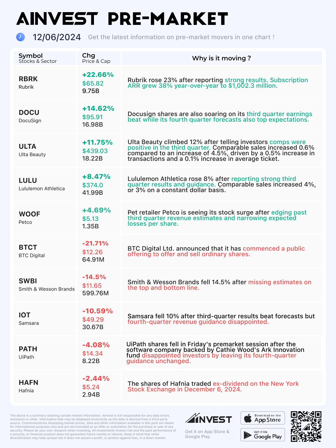 Dec. 06 Pre-market Movers Board: Lululemon Athletica rose after reporting strong third quarter results and guidance