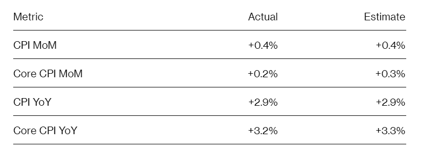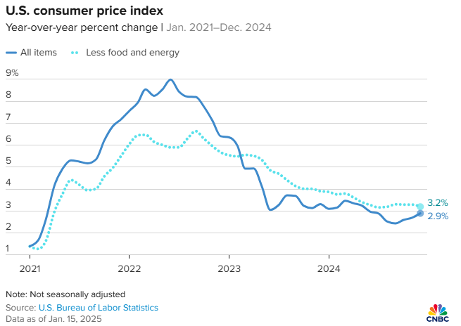 The U.S. Consumer Price Index (CPI) for December aligned with expectations, while the core CPI growth came in below projections. December CPI rose by 2.9% YoY, while core CPI, excluding food and energy, increased by 3.2%, slightly below the anticipated 3.3%.