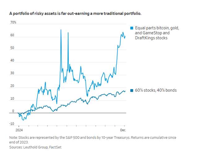 An interesting set of data is as follows: A portfolio holding an equal amount of Bitcoin, gold, meme stock GameStop, and sports betting stock DraftKings has achieved a return rate of 62% in the first 11 months of this year. According to the financial company Leuthold Group, this is more than three times the return rate of the traditional 60/40 stock-bond portfolio—although the U.S. stock market has risen by about 27% this year, which is already quite good, it still pales in comparison to the return rate of these high-risk targets...