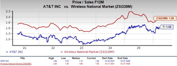 From a valuation standpoint, AT&T trades at a forward price-to-sales ratio of 1.58, below the industry tally of 1.96.