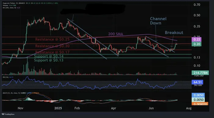 Dogecoin news today is once again grabbing headlines as it tries to stay steady above the $0.20 mark. The meme coin is currently priced at $0.20, rising slightly by 5% in the last 24 hours, and is up 17% over the past week. Trading volume has dropped a bit, now sitting at $1.93 billion, showing that traders are anything but asleep at the wheel.