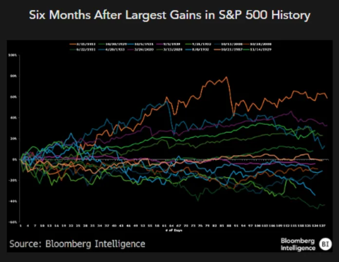 However, looking over a longer time frame, the bulls ultimately prevail. Since 1950, buying into the S&P 500 following historic one-day surges and holding for at least a year has always resulted in positive returns.
