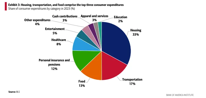 The Institute noted that rising rent burdens have made shelter the most persistent upward mover in consumer baskets for three consecutive years, while transportation’s wallet share has declined as gas prices moderated. The Bureau of Labor Statistics data cited in the report showed housing comprising 33% of the average consumer’s expenditures, far outweighing more discretionary categories.