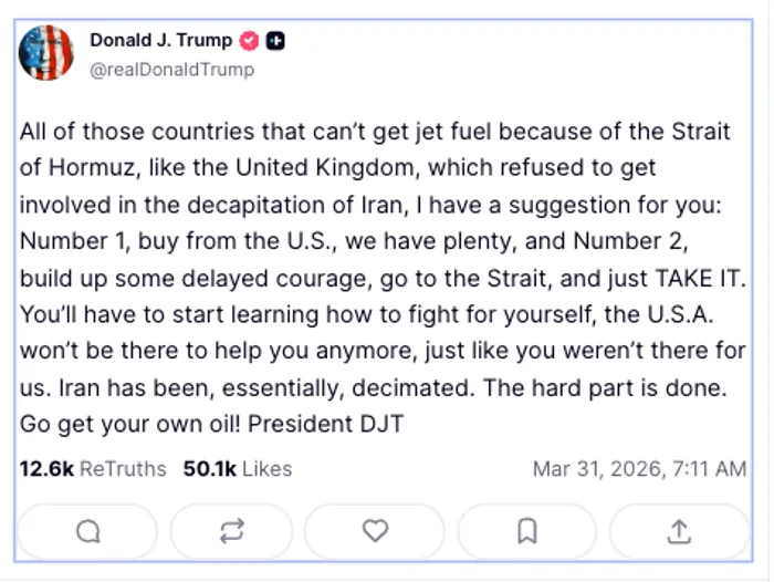 “All of those countries that can’t get jet fuel because of the Strait of Hormuz… go to the Strait, and just TAKE IT… the U.S.A. won’t be there to help you anymore… Iran has been, essentially, decimated. The hard part is done.”