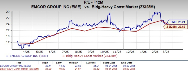 EME stock is currently trading at a premium compared with the industry peers, with a forward 12-month price-to-earnings (P/E) ratio of 25.21, as evidenced by the chart below.