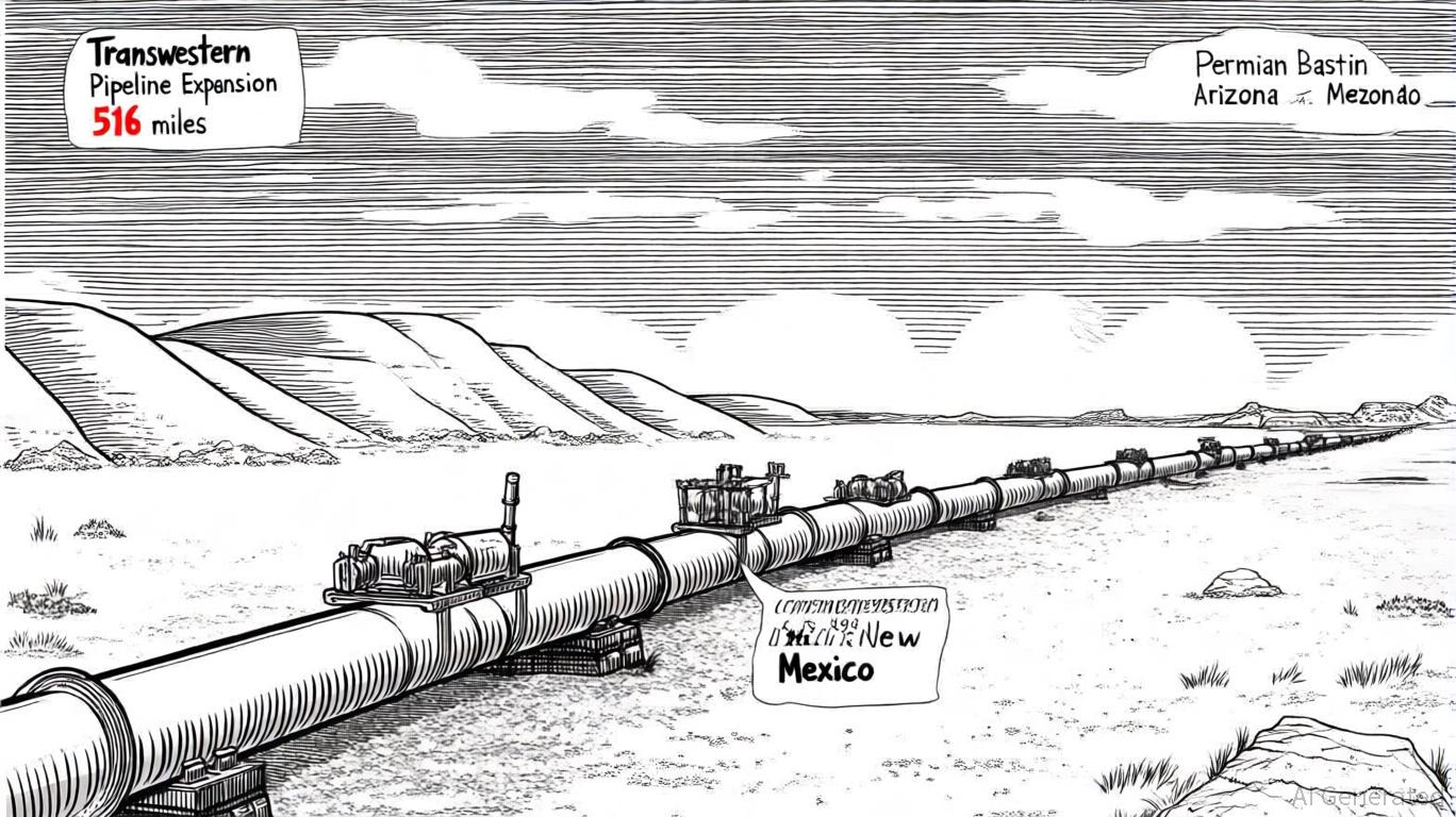 The Transwestern Pipeline Expansion aims to add 1.5 billion cubic feet per day (Bcf/d) of natural gas transportation capacity, connecting the prolific Permian Basin to Arizona and New Mexico by late 2029 [1]. This 516-mile, 42-inch pipeline, supported by nine new compressor stations, is designed to address energy shortages driven by population growth, data center development, and the rise of high-tech industries in the Southwest [3]. With long-term commitments from investment-grade customers like Arizona Public Service (APS) and Salt River Project (SRP), the project's demand is already secured, and