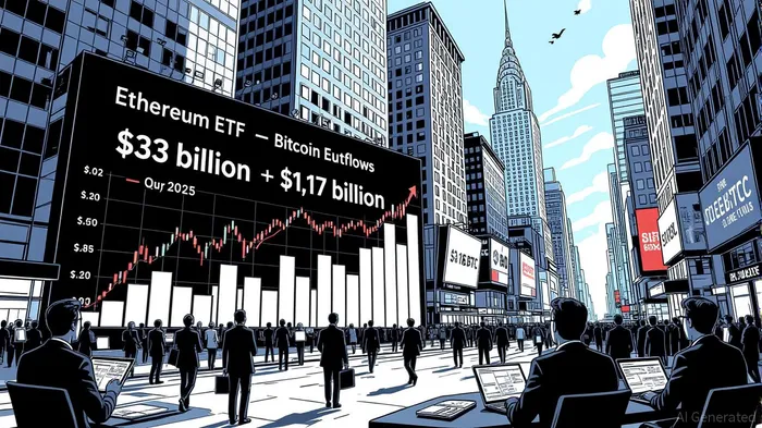 Ethereum’s dominance in institutional adoption has intensified in Q3 2025, with ETFs attracting $33 billion in inflows—a stark contrast to Bitcoin’s $1.17 billion in outflows [1]. Investment advisors and hedge funds have amplified their Ethereum ETF exposure by 67% and 93%, respectively, in Q2 2025, with advisors now holding 539,757 ETH valued at $1.351 billion [2]. This trend is underscored by Ethereum’s structural advantages: a 4.8% staking yield, a $223 billion DeFi TVL, and a deflationary model that reduces supply over time [1].