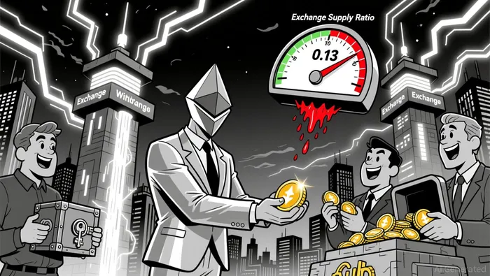 The Ethereum Exchange Supply Ratio (ESR), a metric tracking the proportion of ETH on exchanges, has also declined to a monthly low of 0.13, indicating reduced selling pressure and increased withdrawals from exchanges. This trend aligns with broader on-chain liquidity contraction, as whales shift holdings to private wallets or staking protocols.