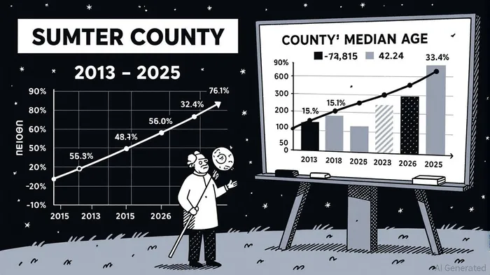 Sumter County's demographic profile is among the most compelling in the nation. As of 2025, 57.78% of its 158,363 residents are aged 65 or older, with a median age of 68.4—making it the oldest county in the United States [1]. For context, Florida's state median age is 42.4, and the national average hovers around 38.5 [1]. This stark divergence underscores a structural shift: Sumter County's population has aged by 4.5 years since 2013, driven by retirees flocking to communities like The Villages, which market active lifestyles for seniors [3].