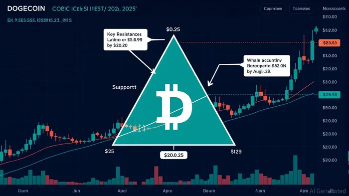 Dogecoin is currently forming a symmetrical triangle pattern between $0.22 and $0.25, a classic consolidation phase that could resolve with a breakout toward $0.28 or a breakdown to $0.19 by August 27, 2025 [1]. This pattern is supported by whale activity, including a significant 900 million DOGEDOGE-- transfer to Binance, signaling growing confidence in the asset [1]. However, conflicting short-term forecasts complicate the outlook: one analysis predicts a $0.26 target in two weeks if bulls break the $0.25 resistance, while another forecasts a drop to $0.2238 within a week [2].