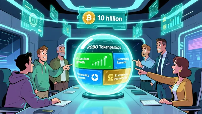 The tokenomics feature a total supply of 10 billion tokens, with a significant portion allocated to the ecosystem and community as outlined. ROBO is currently available for trading on platforms like MEXC and WEEX according to the guide.