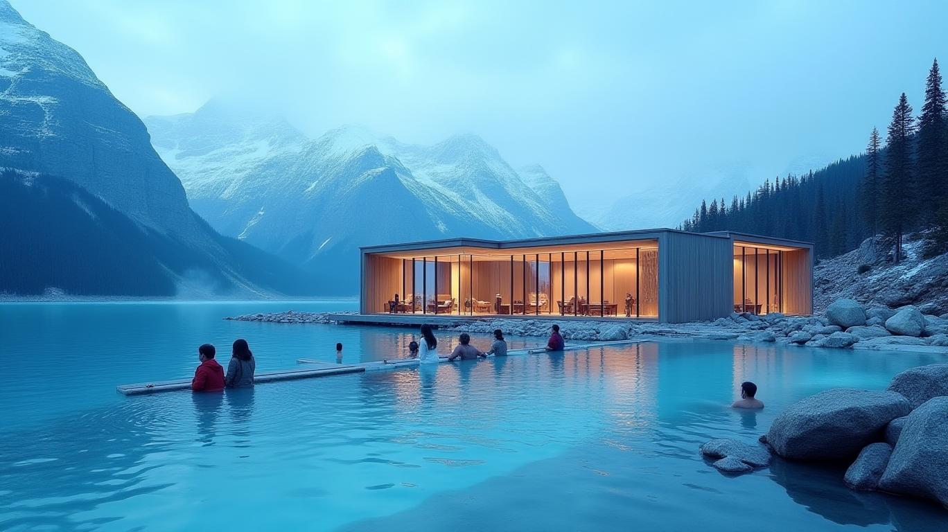 The facility is also set to offer a unique and immersive wellness experience, allowing visitors to connect with the natural environment while enjoying a range of thermal bathing experiences. This aligns with the "Visitor Experience" trail, which aims to enhance the quality and diversity of visitor experiences in the destination. Additionally, the use of natural elements and glacial water sources for the thermal experiences aligns with the "Nature Positive and Climate Action" trail, which seeks to protect and promote the natural heritage of the lands while mitigating the impacts of climate change.