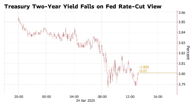 Yields on two-year notes dropped by as much as 8 basis points to below 3.79%, while five-year yields fell nearly 10 basis points to under 3.93%, reflecting their sensitivity to anticipated Fed policy shifts.