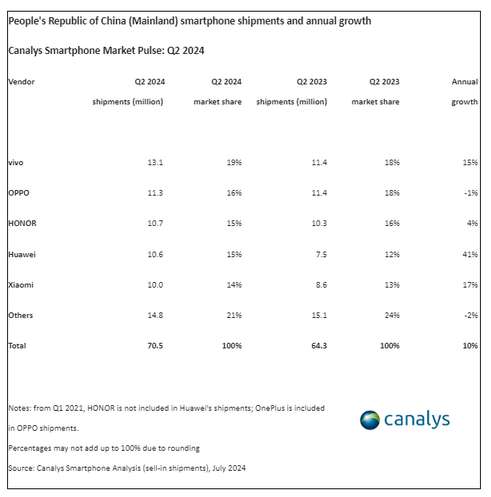 According to Canalys's report, overall, the Chinese smartphone market grew by 10% year-on-year in the second quarter, with shipments exceeding 70 million units.