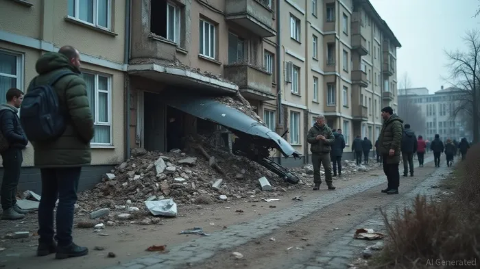 In a recent incident, fragments of downed Ukrainian drones fell on an apartment building in Bryansk, Russia, but no casualties or damage were reported. According to the Defense Ministry, 24 drones were shot down over the Bryansk Region as part of a larger operation that saw 54 Ukrainian drones intercepted and destroyed across various Russian regions [1].The Bryansk Region Governor, Alexander Bogomaz, confirmed that the attacks did not result in any injuries or property damage. He stated that response teams were working on the ground to assess the situation [1]. The fragments of the downed drones were found at the site of the debris fall, but no casualties were reported after inspections of the affected areas [1].