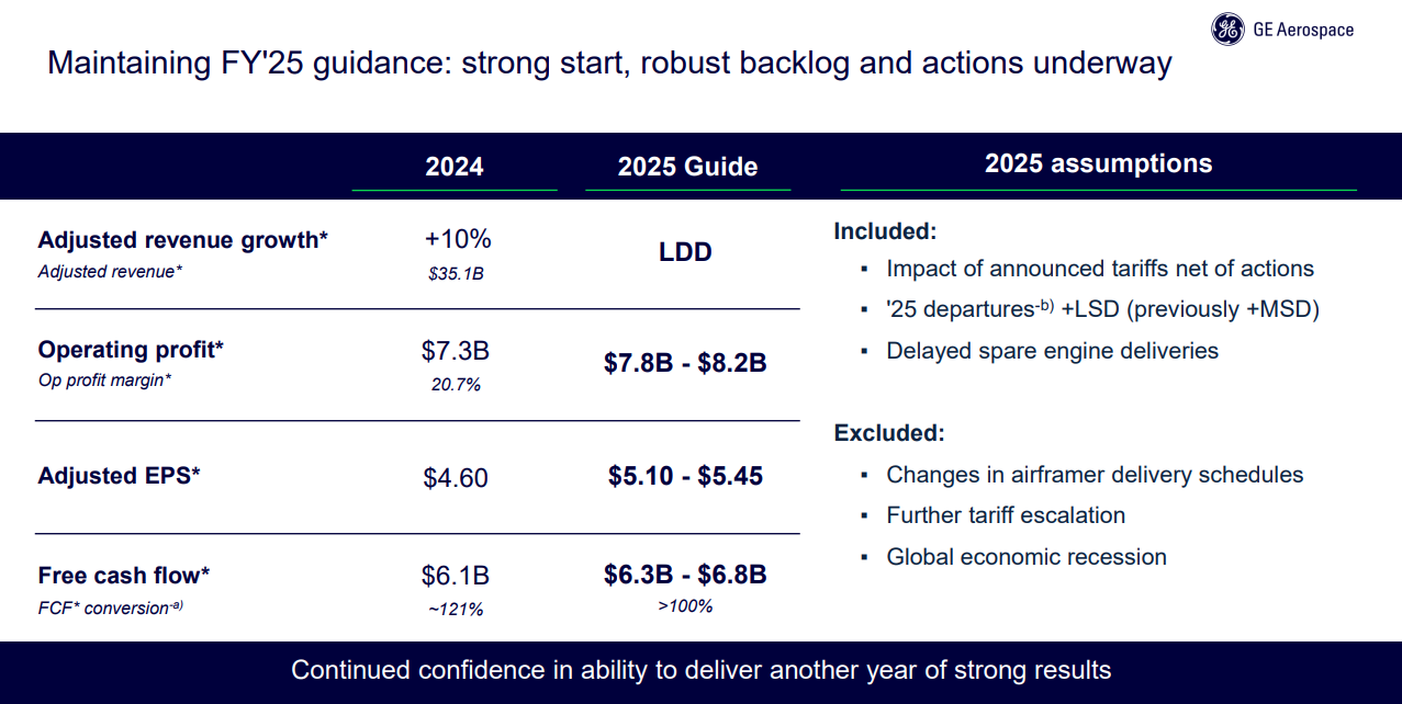Management reaffirmed its full-year 2025 adjusted EPS outlook of $5.10 to $5.45, in line with the FactSet consensus of $5.42. Revenue is expected to grow at a low double-digit rate, and free cash flow guidance remains in the $6.3 to $6.8 billion range. Notably, GE included additional detail this quarter on the expected impact of newly announced U.S. and international tariffs. Management said the current EPS outlook assumes some tariff effects net of mitigation actions, but it does not account for further escalation or changes in delivery schedules. While the tone around tariffs was measured, the inclusion of these assumptions underscores GE’s vulnerability to shifts in trade policy given its global supply chain and commercial exposure.