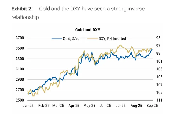 In addition, Fed rate cuts and the Trump administration’s attempts to interfere with the Fed’s independence could further weaken the U.S. dollar. So far this year, gold prices have shown a strong negative correlation with the U.S. Dollar Index (DXY).