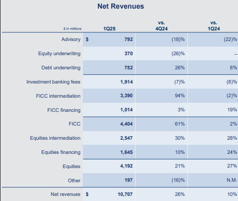 Investment Banking was the weak spot, with total fees down 8% YoY to $1.92 billion. The drop was largely due to a 22% decline in Advisory revenue, reflecting lower deal activity amid tariff-driven economic uncertainty. Equity underwriting revenue held steady, while Debt underwriting grew 7.6% to $752 million, aided by investment-grade and asset-backed issuance. Notably, the firm’s IB backlog expanded, suggesting potential improvement later in the year if market conditions stabilize.