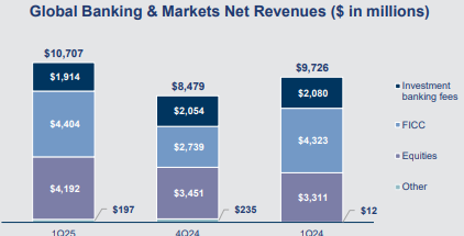 Revenue growth was driven by standout performance in Equities and Debt Underwriting, partially offset by weakness in Advisory. A new $40 billion share repurchase program was also authorized, adding a layer of confidence amid broader market unease.