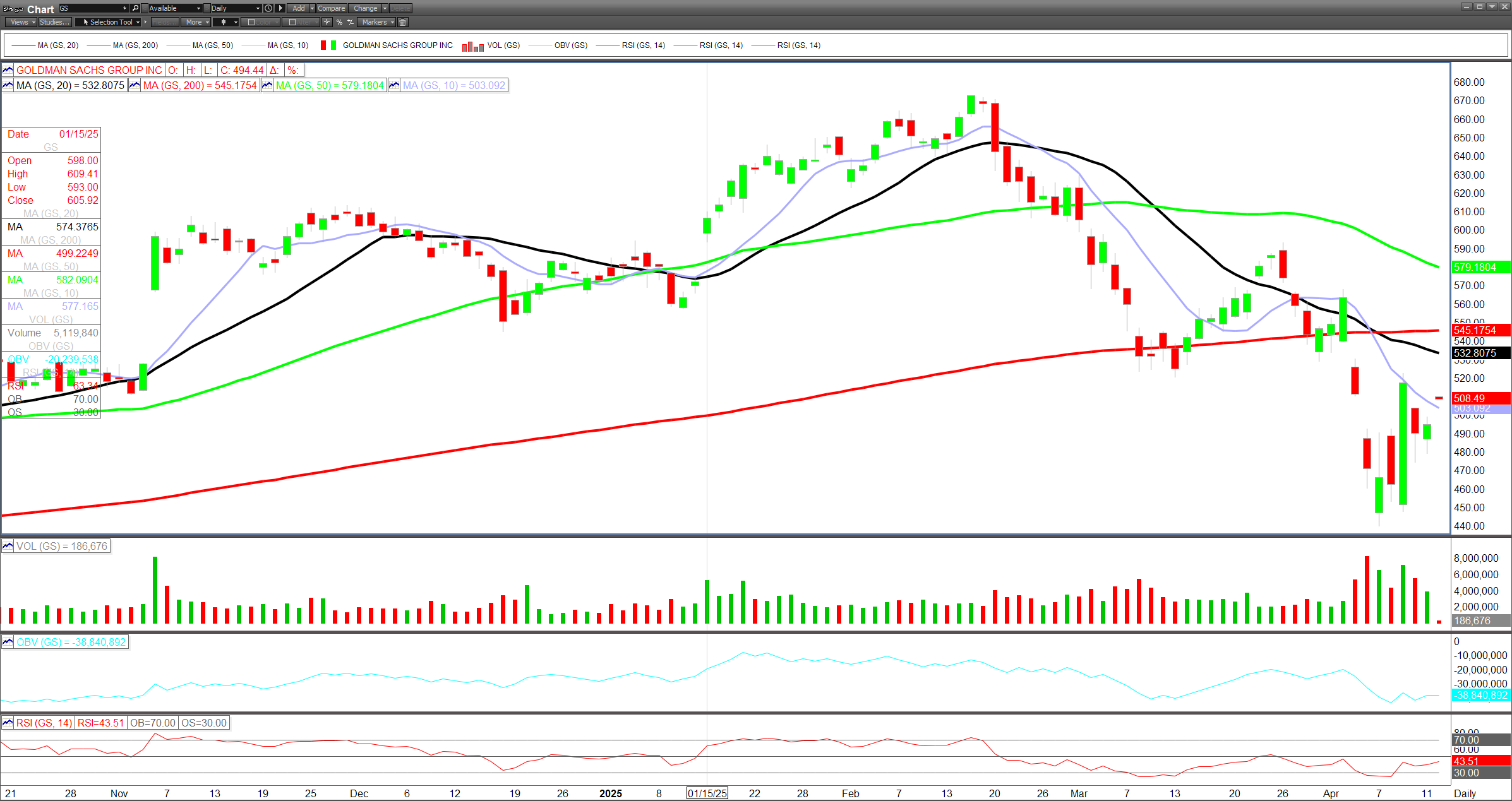 Technically, GSGS-- shares are attempting to reclaim the psychologically important $500 level after falling sharply from $670 in February to a low near $450 last week. The 20-day moving average at $532 and 200-day at $545 represent significant resistance zones. While the environment remains headline-driven and choppy, the $40 billion buyback authorization provides downside support. For now, Goldman appears well-positioned to outperform peers more heavily tied to credit and retail banking as markets adjust to the new trade paradigm.