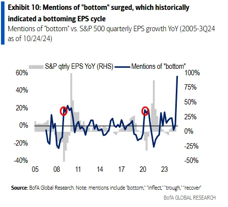 According to Bank of America, mentions of a "bottom" in earnings reports this season have risen by 56% compared to a year ago. Historically, such references have preceded broader improvements in earnings.