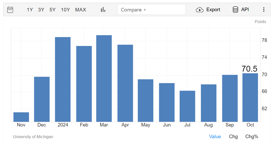 U.S. consumer sentiment reinforces this perspective. The University of Michigan's final October sentiment index rose to 70.5, up from 70.1 in September and a preliminary reading of 68.9