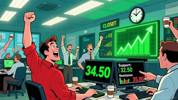 . The recent rally suggests a potential breakout above the $34.50 psychological barrier, with a bullish engulfing pattern forming as the close approaches the high of the session.