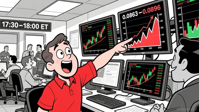 • Price action shows a bullish engulfing pattern from 17:30–18:00 ET, followed by a pullback into 0.082–0.083 range.