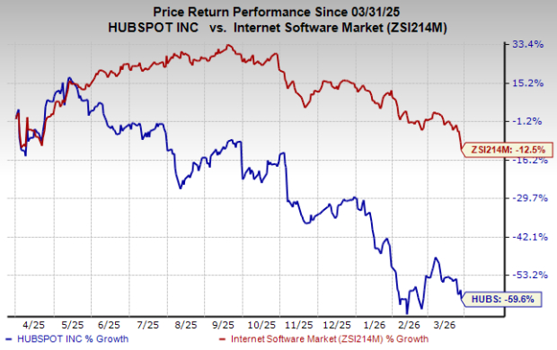HubSpot stock has plummeted 59.6% over the past year compared with the industry’s decline of 12.5%.