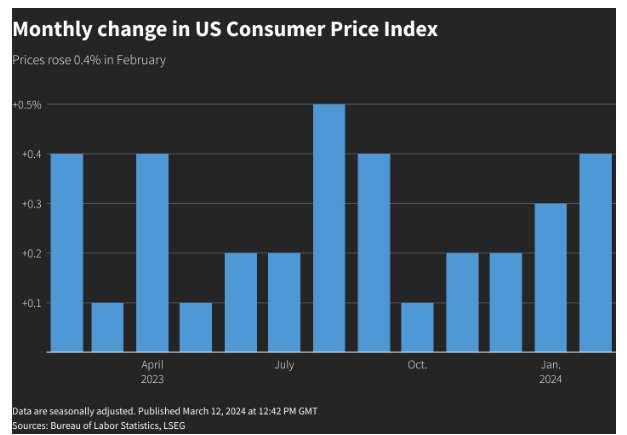 Specifically, the US Consumer Price Index (CPI) rose by 3.2% YoY last month, reaching a new high since December last year, and surpassed the market expectation of 3.1%. At the same time, the MoM CPI also increased by 0.4%. Although in line with market expectations, it still exceeded January's growth rate of 0.3%, indicating that prices are still rising.