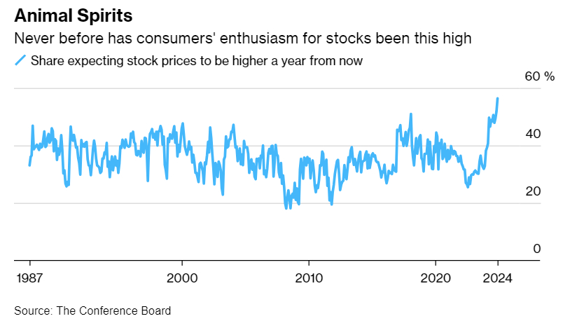 If large sums of cash were truly poised to enter the stock market, bullish sentiment would likely be subdued, reflecting caution about future gains. Yet, retail investor sentiment tells a different story. A recent survey shows that 56.4% of respondents expect the stock market to rise—an all-time high.