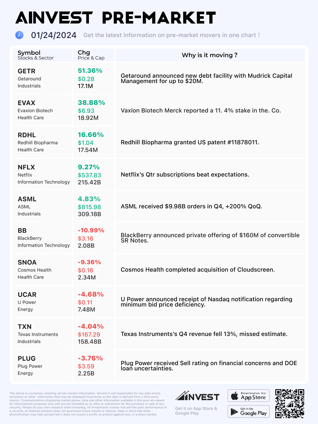 Jan. 24 Pre-market Movers Board: Netflix jumps 9% premarket as Qtr subscriptions beat expectations