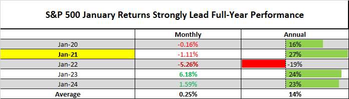 Looking back at the past five years, the average January return is 0.25%, while the average annual return is 14%. This suggests that a 14% annual return for the S&P 500 is a base case if January is uneventful. Even slight negative returns in January, as seen in 2020 and 2021, did not disrupt the long-term bull market, with annual returns of 16% and 27%, respectively.