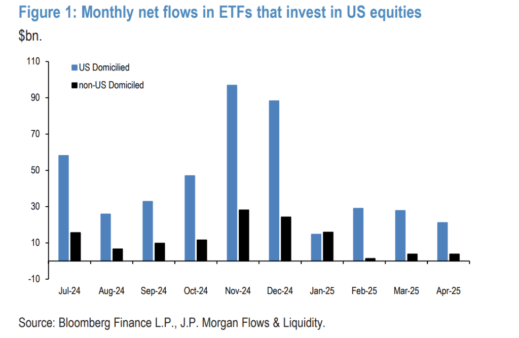 JPMorgan addressed a growing market concern: since mid-February, U.S. equities have underperformed global markets, prompting questions about who's selling and whether foreign investors are exiting. But data cited in the report shows almost no evidence of large-scale selling by foreign investors in either equities or Treasuries.