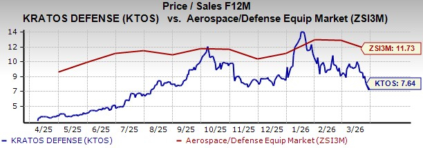 In terms of valuation, KTOS’ forward 12-month price/sales (P/S) is 7.64X, a discount to the industry’s average of 11.73X.