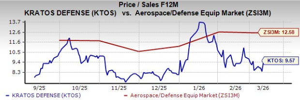 In terms of valuation, KTOS’ forward 12-month price/sales (P/S) is 9.57X, a discount to the industry’s average of 12.58X.